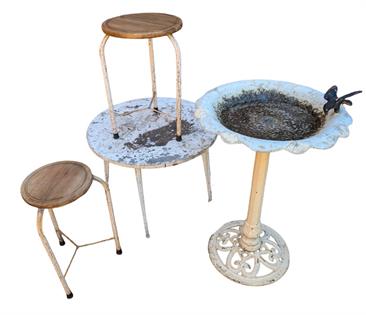 VINTAGE CAST BASE BIRD BATH, METAL TABLE AND STOOLS. TIN BATH AND DECORATIVE BIRD ON CAST BASE
