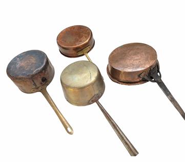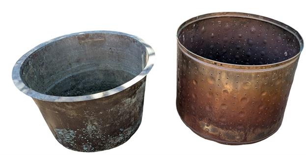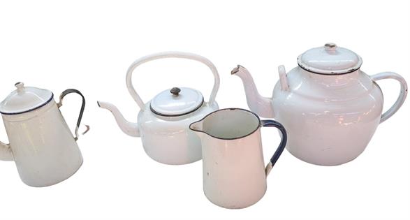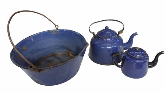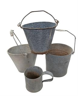 VINTAGE RUSTIC BUCKETS, ALUMINIUM, ENAMEL FOUR