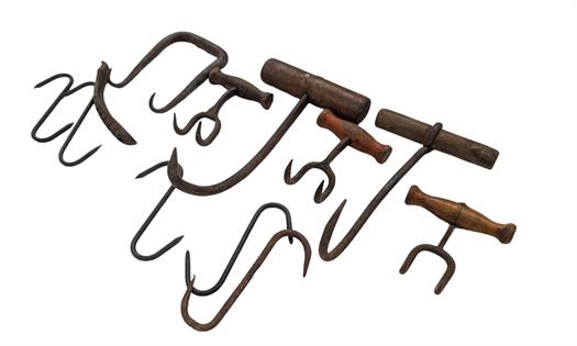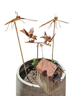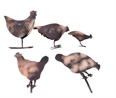 A BROOD OF RUSTY CHOOKS - THREE 2D AND TWO GARDEN STAKES