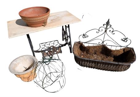 ASSORTED GARDEN ITEMS, MARBLE TOP TABLE ON CAST BASE, POTS, BIRD FEEDER, METAL POT STAKE AND DECORATIVE HANGING BASKET