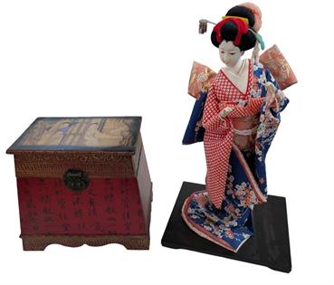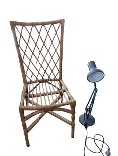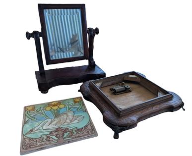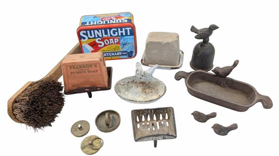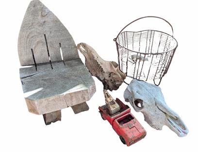 ASSORTED COLLECTABLES: SKULLS, METAL TOW TRUCK, WIRE BASKET, WOODEN CARVED CHAIR AND CAST FLOOR GRATE