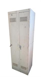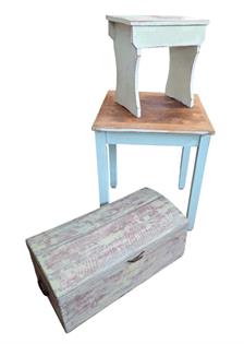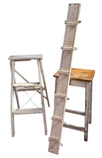 VINTAGE WHITE PAINTED LADDER, SCHOOL HOOKS AND STOOL