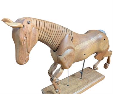 A LARGE MID CENTURY RETICULATED WOODEN ARTIST HORSE ON STAND