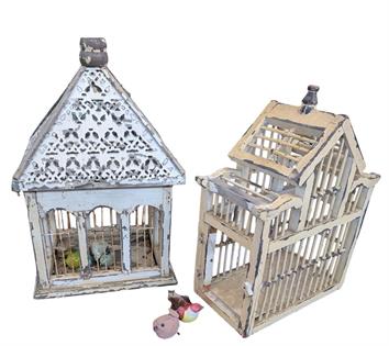 TWO DECORATIVE WOODEN BIRD CAGES WITH LITTLE BIRDS