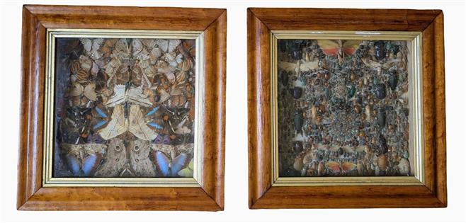 PAIR OF VICTORIAN ENTOMOLOGY SHADOW BOXES - BURR WALNUT FRAMES, GLASS CASED. ONE FULLL OF BUTTLERFLIES AND SOME BUGS, OTHER BUGS AND BEETLES. SOME BITS HAVE SEPARATED FROM PINS (NOT MANY)