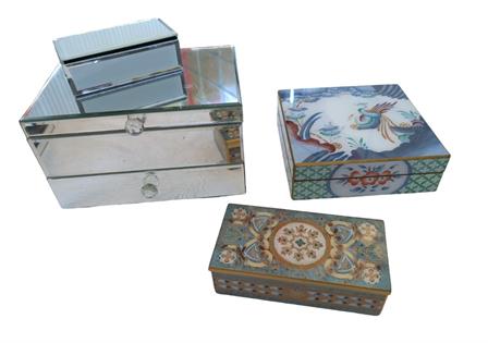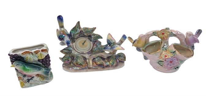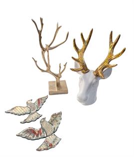 CERAMIC ELK HEAD, BRASS JEWELLERY BRANCH AND MIRRORED BIRDS