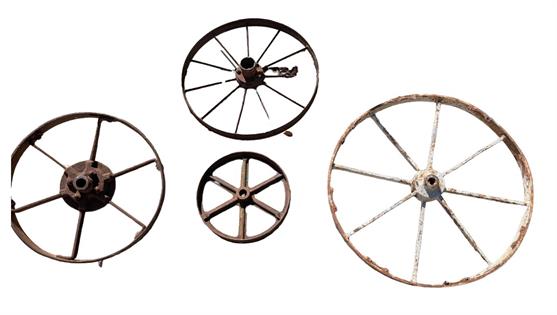 FOUR ASSORTED CAST IRON WAGON WHEELS