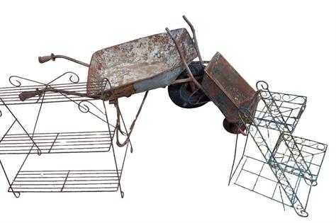TWO VINTAGE WHEELBARROWS AND PLANT STANDS